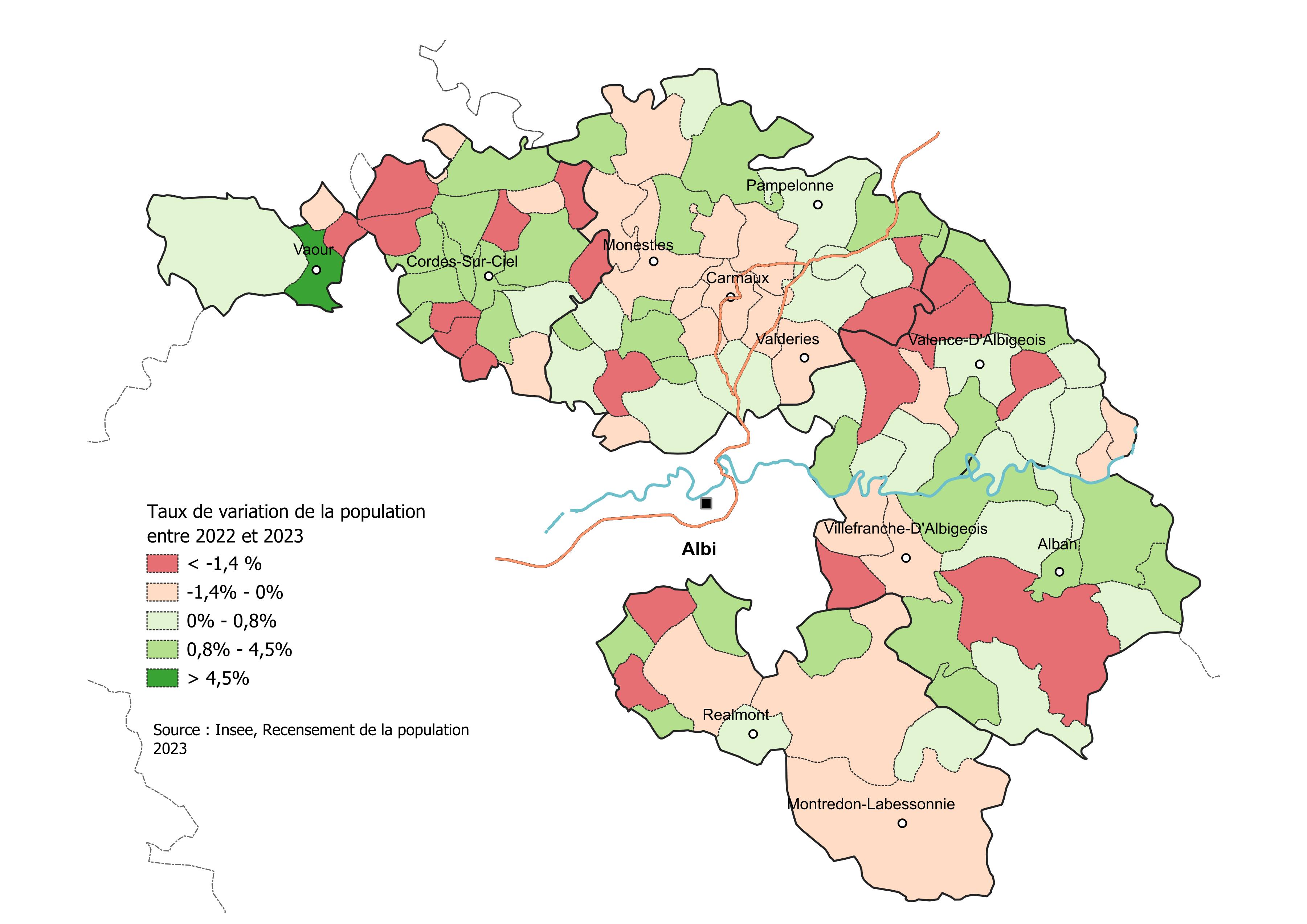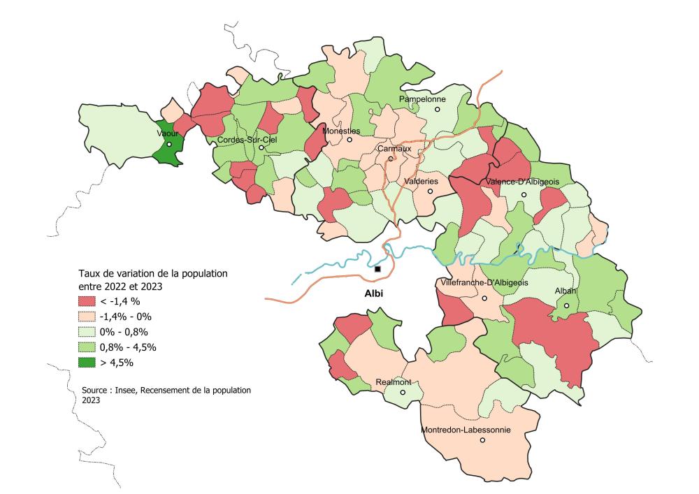 Entre 2022 et 2023, la population du Pôle territorial de l’Albigeois et des Bastides apparaît globalement stable (+ 72 habitants - Population totale 2023 : 59 961) , avec des hausses et des baisses limitées selon les territoires. La Communauté de communes Cordais et Causse se distingue par la plus forte progression démographique sur la période, avec une augmentation d’environ +59 habitants entre 2022 et 2023. Cette évolution confirme l’attractivité résidentielle du territoire, en particulier dans les communes proches de Cordes-sur-Ciel et dans les villages bénéficiant d’un cadre de vie recherché.