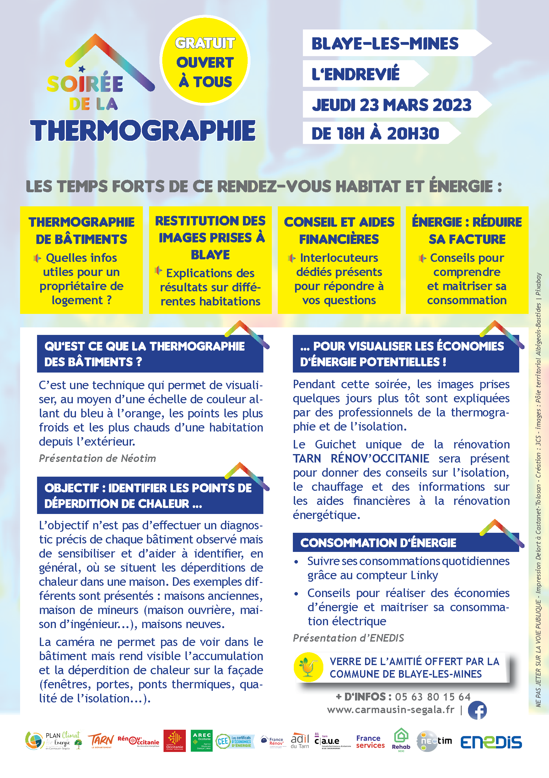 La commune de Blaye-les-Mines et la Communauté de Communes Carmausin Ségala en partenariat avec Tarn rénov'Occitanie organisent ce jeudi 23 mars 2023 un nouveau rendez-vous Habitat et Energie à Blaye-les-Mines pour en savoir plus sur les déperditions de chaleur potentielles dans la maison, les conseils pour suivre et maitriser sa consommation d’énergie, les aides financières rénovation et isolation.