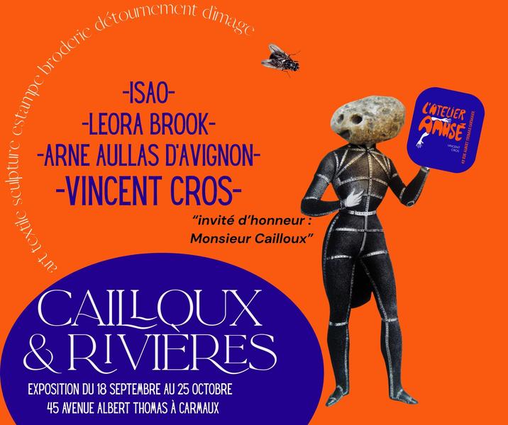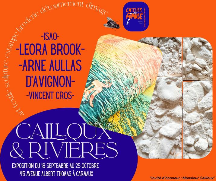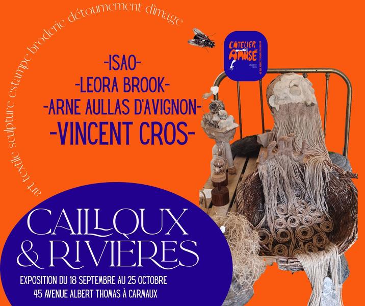 Du Viaur à l’Aveyron, de l’art textile à la gravure, de la sculpture au détournement d’image, on découvrira comment cours d’eau et cailloux ont infiltré quatre univers créatifs pour donner des œuvres aussi différentes que surprenantes. Ainsi les cailloux deviennent rivière, personnage, textile et l’eau couleur, fil, ligne et image en mouvement.