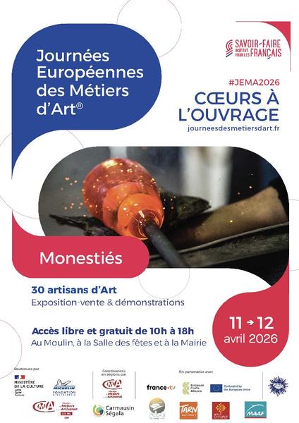 Les 11 et 12 avril 2026, découvrez les JEMA, Journées Européennes des Métiers d’Art, un week-end d’exception qui marquera également l’ouverture estivale des sites patrimoniaux de Monestiés !