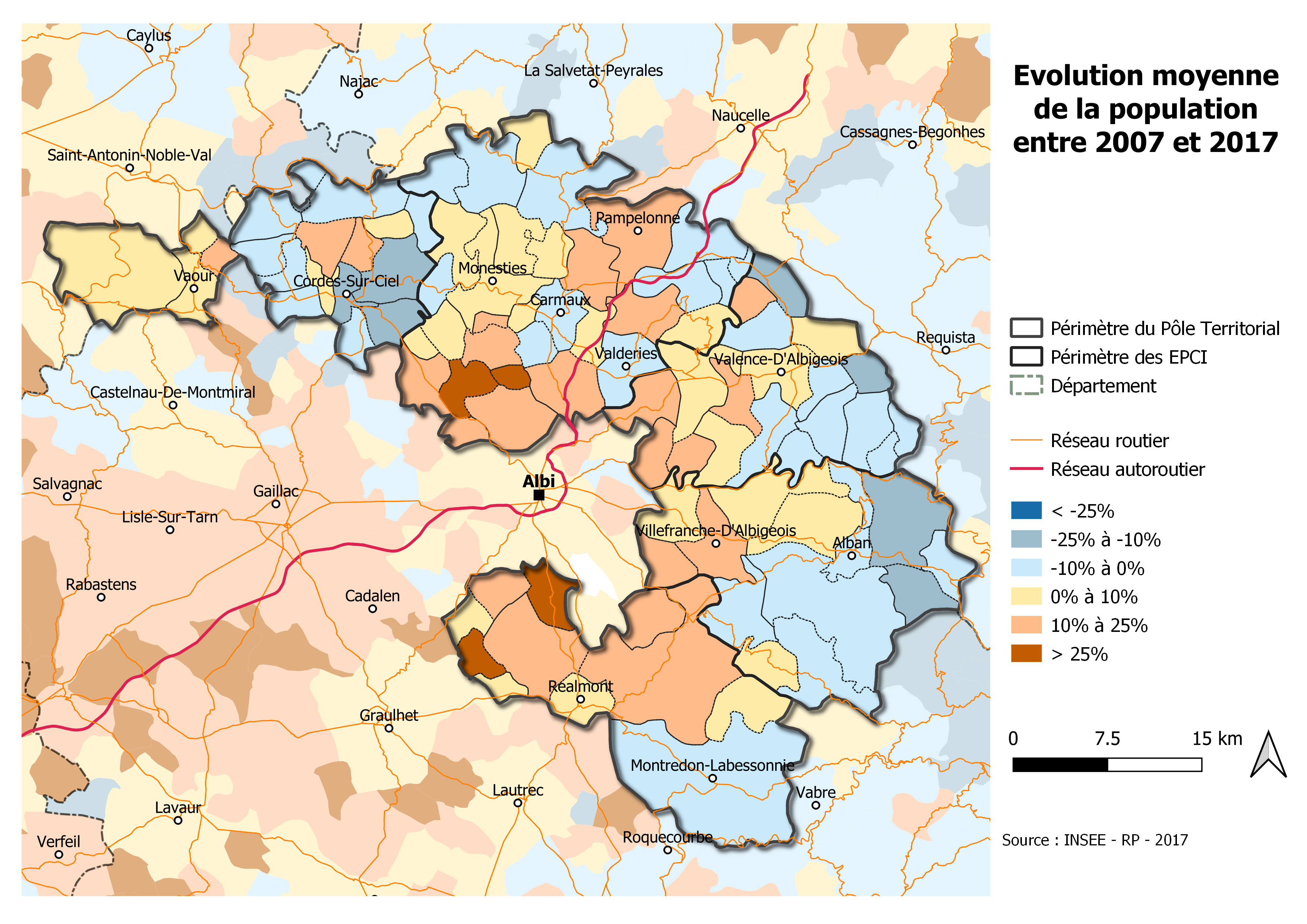 La croissance démographique est faible (+ 0,12%/an) et cache des disparités entre les territoires sous influence de l’aire urbaine albigeoise où la population augmente fortement par rapport aux territoires plus ruraux. Le secteur sous influence directe de l’aire urbaine d’Albi, de l’A68, de l’axe Toulouse-Rodez et de l’axe Albi-Castres pour le Sud, voit sa population augmenter de façon significative avec, par exemple, une évolution de plus de 9 % pour le Centre Tarn entre 2007 et 2017. A l’inverse, certaines communes les plus éloignées du pôle albigeois, au nord et au sud-est, sont toujours en perte de population.